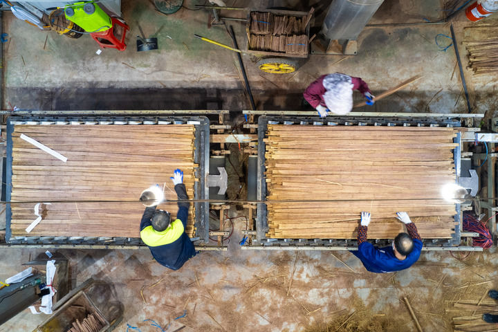 2024年12月10日,在位于永州市双牌县竹木产业智能科技园的湖南省有竹科技有限公司,工人在处理竹条。新华每日电讯记者陈思汗摄