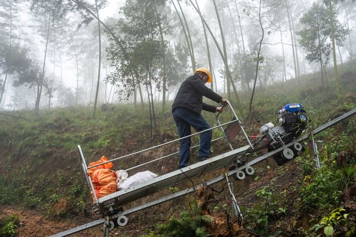 2024年12月10日,在永州市双牌县何家洞镇笋材两用林培育基地,村民操作运笋车运送刚采摘的竹笋。新华每日电讯记者陈思汗摄