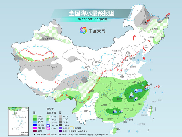 后天,新疆北疆、内蒙古东北部、东北地区北部、西藏北部和南部、西北地区中部和东南部、川西高原北部等地部分地区有小到中雪或雨夹雪,局地有大雪。江汉东部、江淮、江南中东部、华南北部等地部分地区有中到大雨,局地有暴雨。