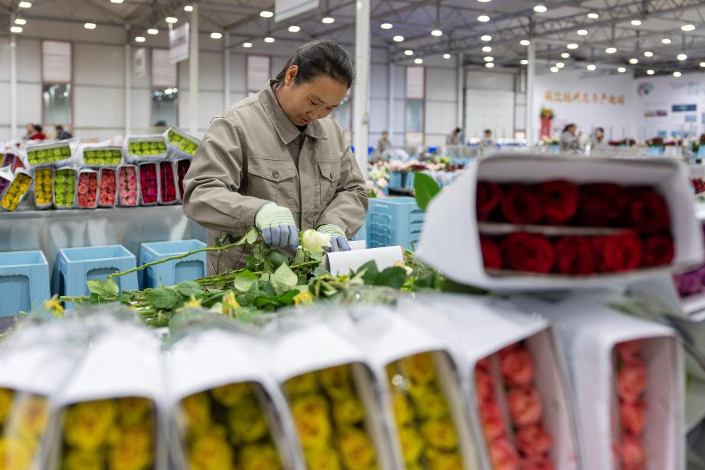 近日,工作人员在云南丽江现代花卉产业园包装鲜花。