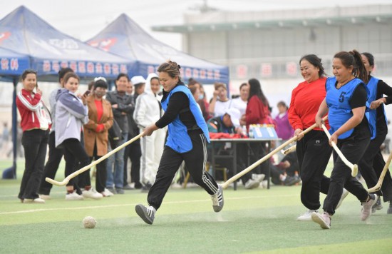达里雅布依乡女子麦热球队队员(蓝衣者)在比赛中。新华社记者 胡虎虎 摄