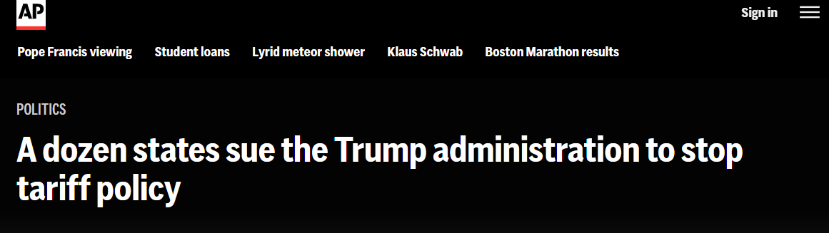 中国日报网4月24日电 据美联社(AP)报道,当地时间4月23日,美国12个州在位于纽约的美国国际贸易法院对特朗普政府提起诉讼,要求其停止加征关税,并指控关税政策违法,给美国经济带来了混乱。