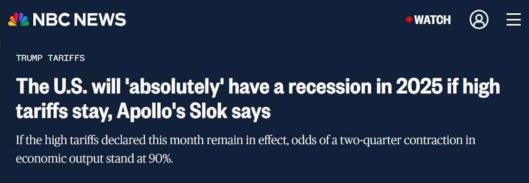 这位私募机构经济学家指出,若本月初实施的高关税政策不作调整,美国经济产出连续两个季度萎缩的概率高达90%,国内生产总值将下滑4个百分点。