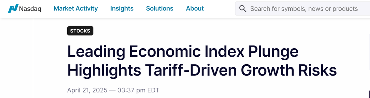 另据纳斯达克官方网站,美国经济咨商局21日公布的数据显示,美国先行经济指数(Leading Economic Index)3月下跌0.7%,创下2023年底以来的最大月度跌幅,超过此前经济学家预期的0.5%。这一下降反映出,随着关税对贸易流动和商业情绪的影响越来越大,人们越来越感到不安。先行经济指数是衡量美国未来经济活动的关键指标。