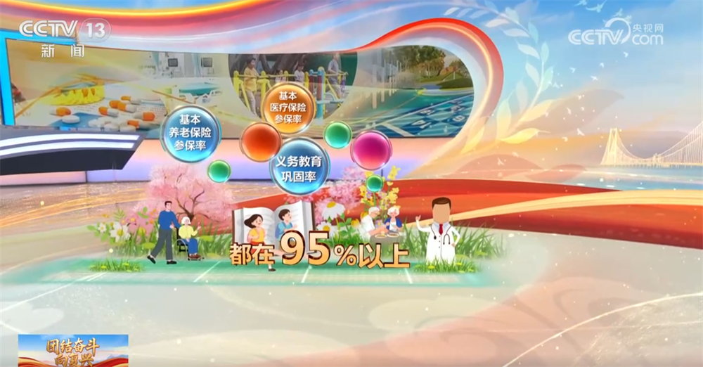 这五年,经济发展、科技进步的成果实打实地转化为群众的获得感和幸福感。我国已建成全球规模最大的教育体系、社会保障体系、医疗卫生体系,义务教育巩固率和基本养老保险、基本医疗保险参保率都在95%以上。