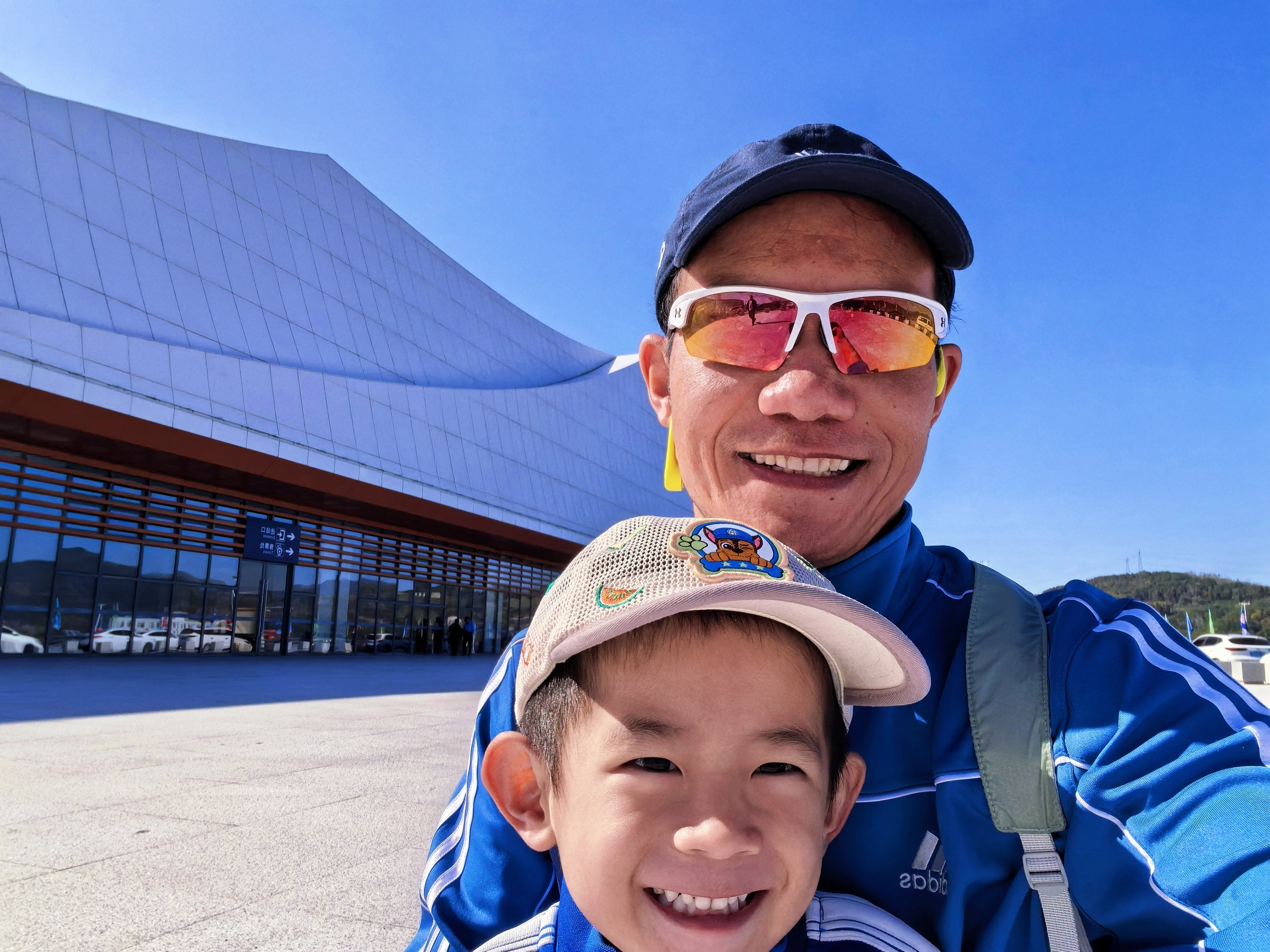 旅程的序章始于前一日。9月27日清晨,我刚跑完一场半程马拉松,休息片刻,便载着橡果骑上山地自行车,从家门口出发,沿北安大街缓缓前行。11.37公里的路程,没有匆忙的赶路,只有秋风里的惬意与儿子雀跃的呢喃,最终顺利抵达白山东站。按相关规定,不满六周岁的橡果本可免票,但我还是特意为他买下人生中第一张半价火车票(2025年10月1日起,纸质火车票将正式退出历史舞台,所以,这也是他人生中唯一的一张纸质火车票)——这张小小的粉色票根,是他成长的纪念,更是属于父子俩的专属仪式。购完票后,我们在还未正式运营的白山东站站牌下、候车厅前拍了一张又一张打卡合影,镜头里的笑容,成了出发前最温暖的注脚。