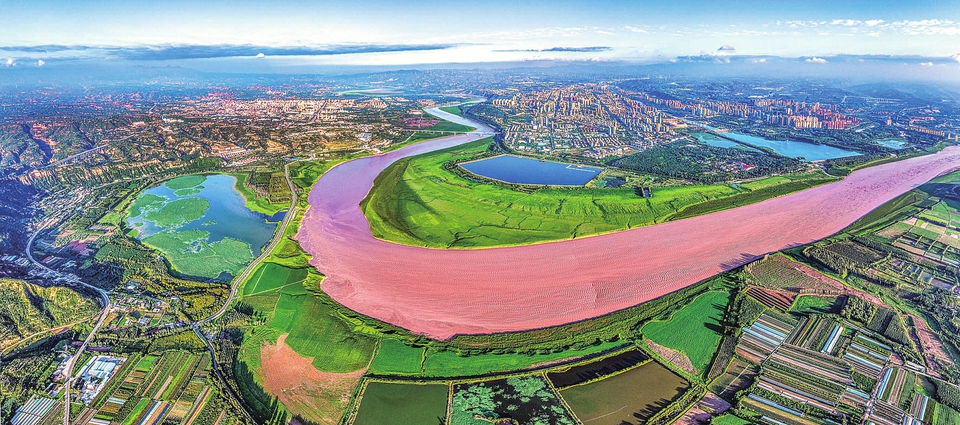 金秋时节,空中俯瞰平陆县境内黄河岸畔,奔腾的黄河、即将收获的秋粮作物与美丽新村彼此映衬,共同织就秋日独有的自然生态长卷。(薛俊 摄)