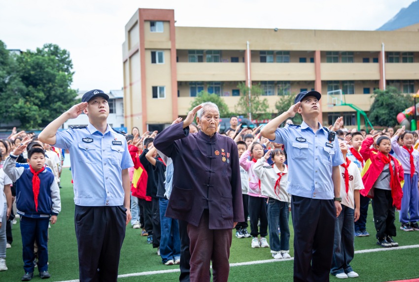 随着《义勇军进行曲》响起,老兵将佝偻的腰板挺直,颤巍巍地举起右手,向国旗敬礼。他与在场师生、民警一同高唱国歌,目光始终追随着冉冉升起的五星红旗。