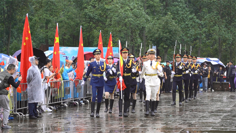 10月1日上午9时,四川剑门关景区北门广场上举行了庄严的升旗仪式。尽管天空飘着细雨,现场依然聚集了来自全国各地的游客,大家共同见证五星红旗冉冉升起,以最真挚的方式为祖国献上祝福。