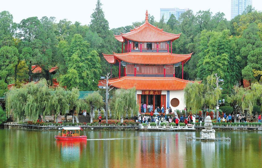 10月1日,昆明大观楼举行开楼仪式。这是大观楼历经一年多修缮后重新对游客开放。大观楼始建于清康熙二十九年(公元1690年),是昆明乃至云南的文化地标。大观楼修缮工程自2024年5月27日开工,如今焕然一新,迎接中外游客前来登楼观光。 (记者 杨峥 摄)