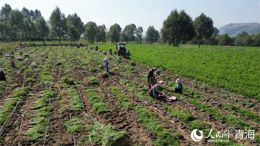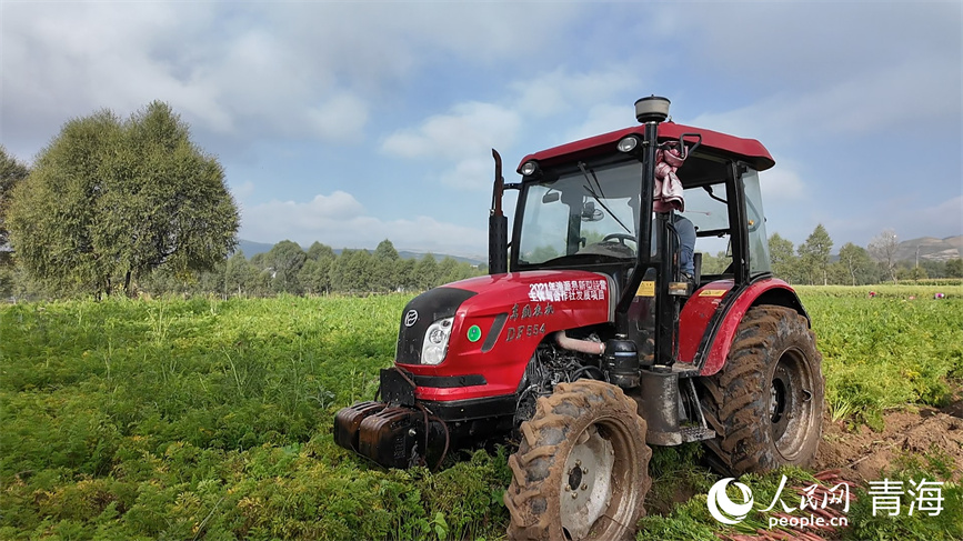 湟源县胡萝卜种植基地里农机正在工作。人民网 马可欣摄