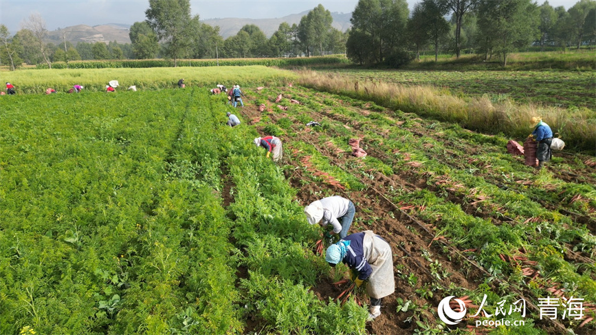 秋风一起,青海省西宁市湟源县胡萝卜种植基地里也热闹起来了。农机“轰隆隆”地翻开湿润的泥土,一排排胡萝卜从地里“探”出头来。村民们麻利地捡拾、装袋,不一会儿,田埂上就堆起了一座座橙红色的“小山”。作为高原冷凉蔬菜产业的代表,今年湟源县1000亩胡萝卜喜获丰收,预计亩产达到3000公斤。
