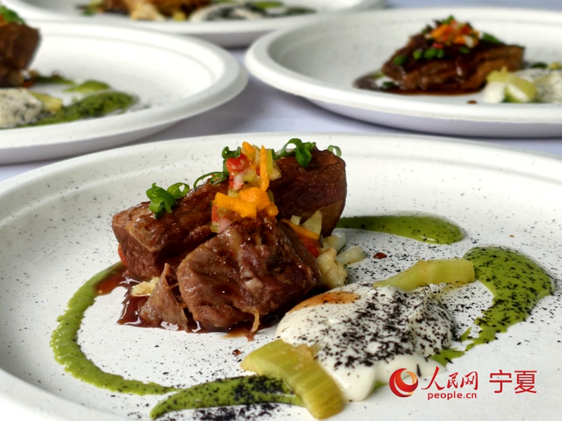 比赛现场,烹饪的香气与食材的新鲜气息交织,12位厨师各展所长,在锅碗瓢盆的交响中开启创意比拼。他们围绕固原特色食材,将不同菜系的烹饪技艺与地方风味巧妙融合,让食材焕发全新生命力。北京厨师葛旭精准捕捉固原羊肉鲜而不膻的特质,精心烹制京菜“芝麻烧羊肉”,尽显传统京味与地方食材的碰撞之美;外国厨师卡洛斯?索托马约尔则选用肉质鲜嫩的六盘山牛肉,以牛骨汤慢炖的西式做法,呈现出口感浓郁、兼具异域风情的牛肉料理;本土厨师马文山更是深挖本地食材潜力,将沙葱、彭阳辣椒制成五彩酱料,搭配固原黄牛牛肋条,并辅以西蓝花、马铃薯等本地食材,创作出兼具视觉美感与西北风味的“五彩牛肋条”,尽显本土饮食文化的独特魅力。