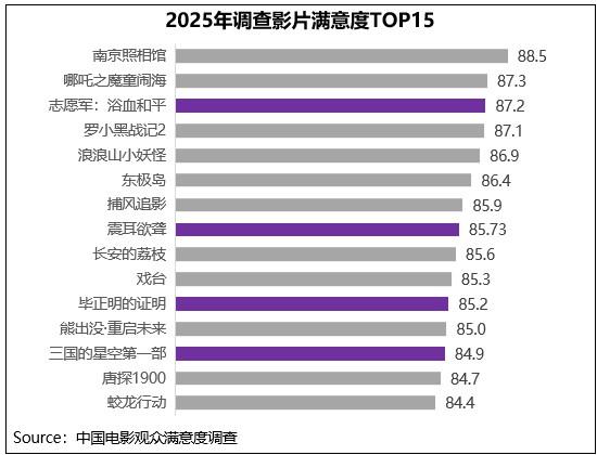 中国电影观众满意度调查?2025年国庆档调查结果显示,国庆档满意度得分85.4分,同比增长2.1分,为近四年最高。档期影片类型丰富、题材多样,满足假期观众多元化的观影需求。调查的7部影片中有3部超85分,战争题材的《志愿军:浴血和平》以87.2分居首,两部剧情片《震耳欲聋》《毕正明的证明》分居第二、第三位。