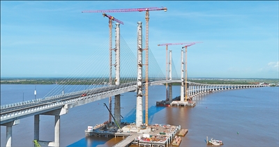 在圭亚那首都乔治敦西部,德梅拉拉河奔涌流向大西洋。1.8公里宽的河面上,一座钢筋混凝土斜拉桥凌空飞架,成为城市的新地标。这是由中国铁建国际集团有限公司(以下简称“铁建国际”)承建的新德梅拉拉河大桥(见图,胡自含摄)。圭亚那总统阿里在日前举行的通车仪式上表示,大桥是商业、工业和民众生活的“生命线”,它将显著提升运力,缓解交通压力。大桥的正式通车标志着圭亚那一系列基础设施变革的开端。