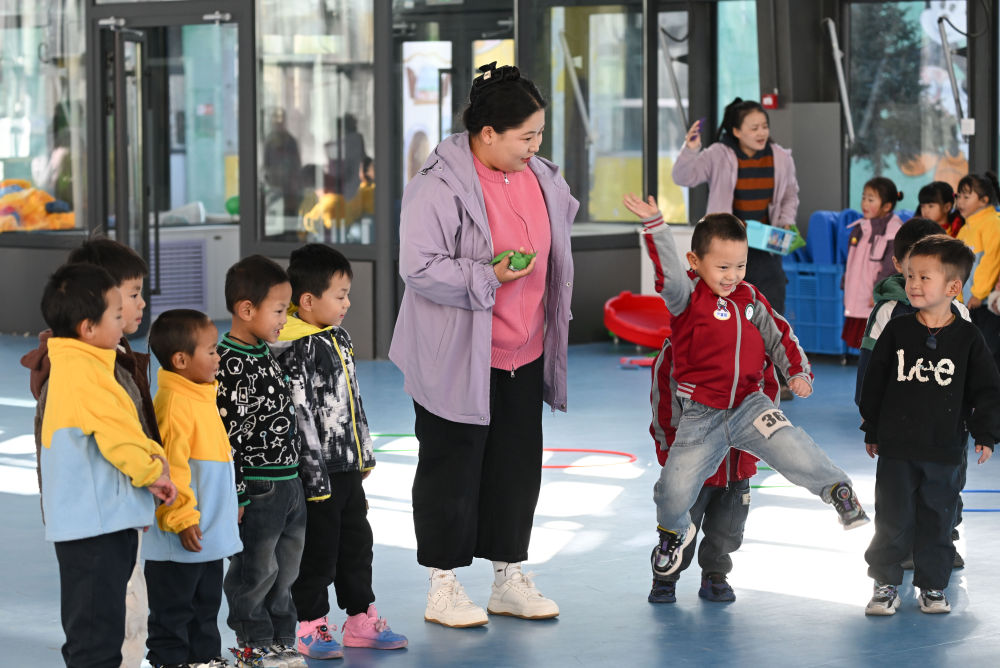 2024年11月14日,在青海天峻县民族幼儿园,小朋友们在老师带领下上体育课。新华社记者 张龙 摄