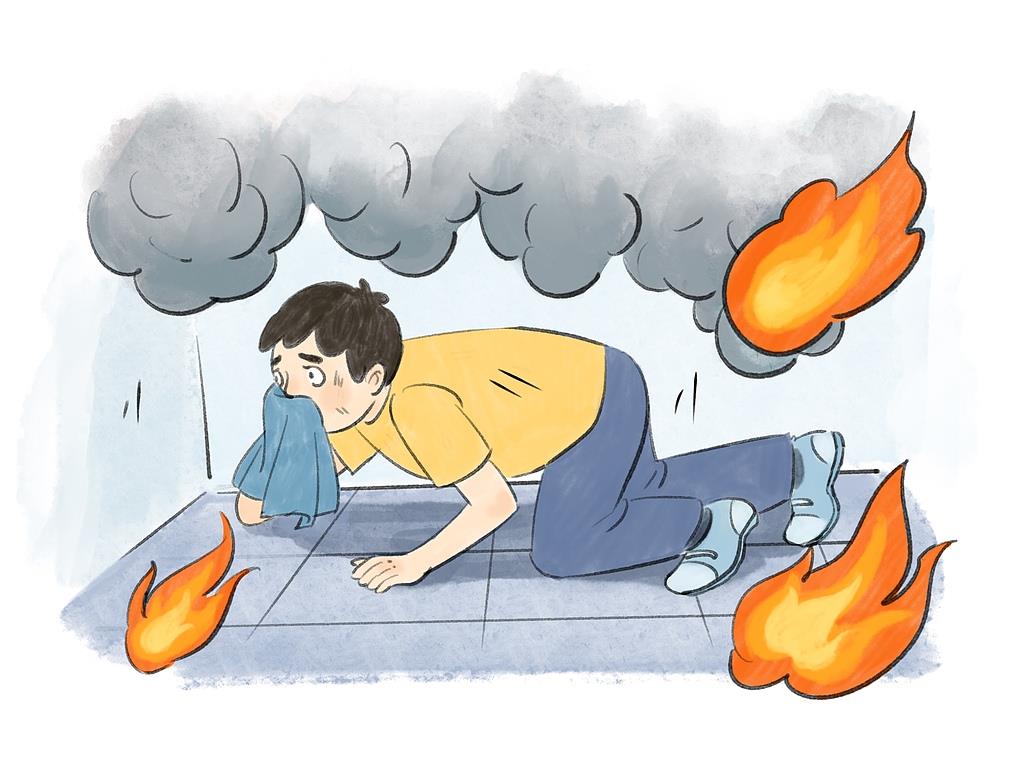 - 火势大、烟雾浓或楼梯间着火时,待在家中更安全。请关闭房门,用湿毛巾、湿衣物等堵住门缝,阻挡烟雾进入。