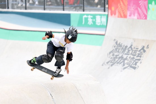 滑板赛场更是少年天下。当天决出的4枚金牌中的3枚被青少年选手获得,摘得奖牌的12人中有9人尚未成年。当天年龄最小的冠军产生在女子碗池,13岁的广东选手邹明珂以0.32分的微弱优势反超12岁的山东选手孟令妍,拿下金牌。