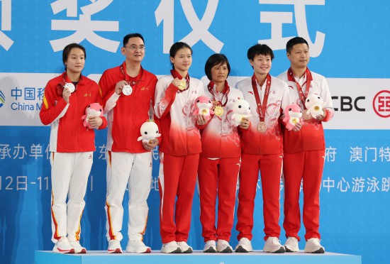 11月11日,获得冠军的广东队选手林珊(左三)、获得亚军的四川队选手陈佳(左一)、获得季军的广东队选手陈艺文(右二)和她们的教练员在颁奖仪式上合影。新华社记者 杨世尧 摄