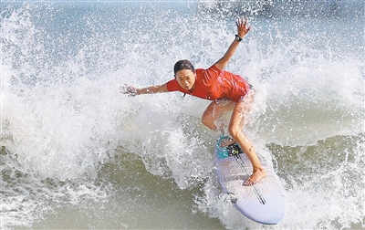 海南队选手在冲浪项目女子短板比赛中。 新华社记者 卢汉欣摄