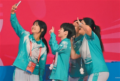 广州体育学院亚运篮球馆,志愿者在结束工作后自拍留念。 本报记者 马国英摄