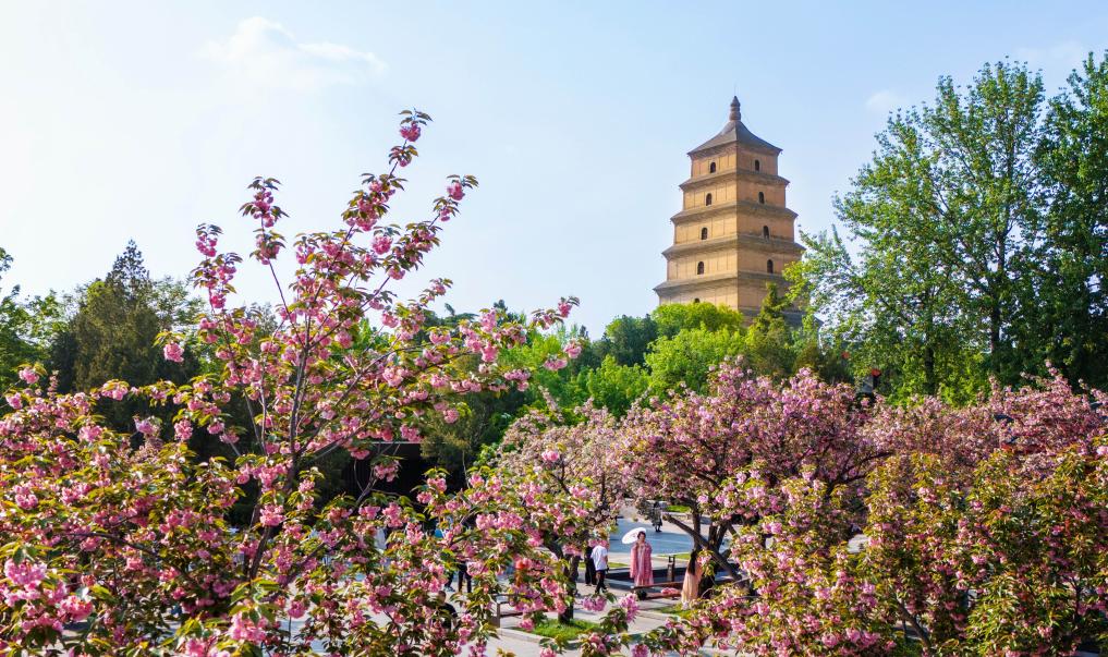 游客在西安大雁塔下游览。新华社记者 邹竞一 摄