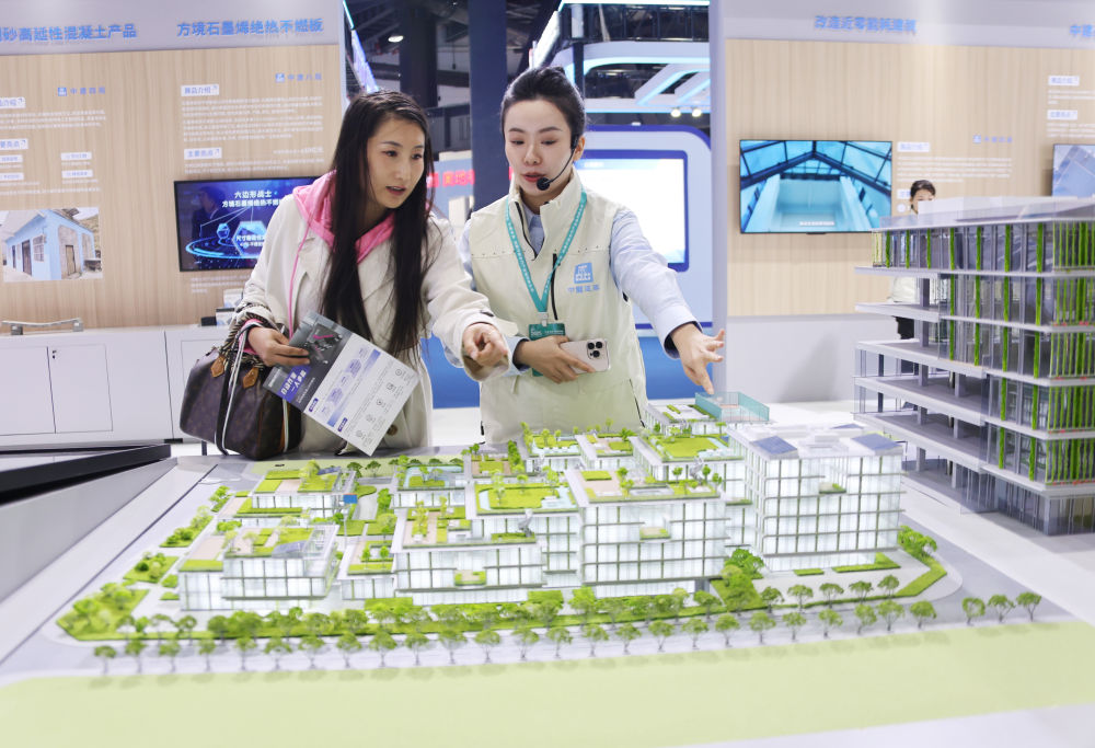 11月6日,讲解员(右)在住博会上向观众介绍展出的节能建筑。新华社记者 潘旭 摄