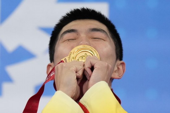 11月17日,湖北队选手闫子贝在颁奖仪式上亲吻金牌。新华社记者 薛宇舸 摄