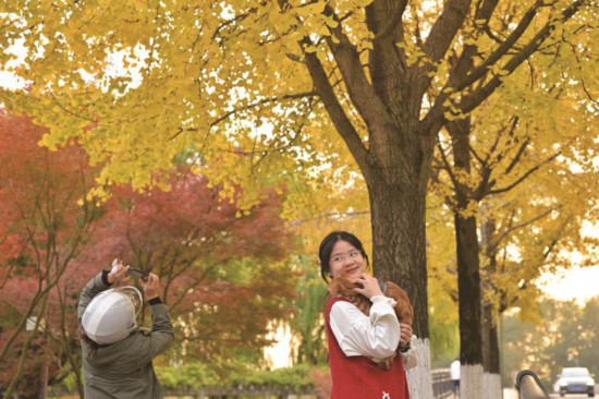 11月23日,嘉兴市区三塔路两边,游人在银杏树下拍照、游玩。