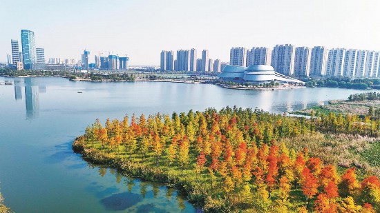 绍兴滨海新区南北湖旁的湿地近日层林尽染,红树如火似霞。建筑曲线与自然光影勾勒出动静相宜的画卷,尽显新区的现代气韵与生态之美。(骆烨)