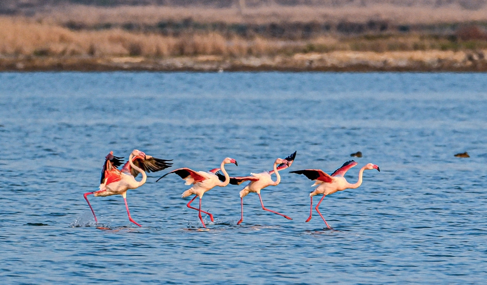 11月19日,火烈鸟在运城盐湖湿地飞翔。初冬时节,野生火烈鸟飞抵湿地,开启栖息越冬之旅,成为盐湖冬日一大景观,吸引众多摄影爱好者前来拍摄。(薛俊摄)
