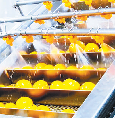 在浙江艾佳果蔬开发有限责任公司,胡柚正在生产线上进行清洗。 徐林辉摄(人民视觉) |