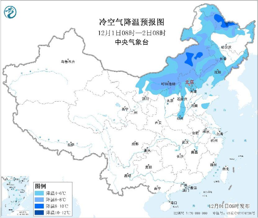 寒潮影响持续。未来三天,寒潮影响还将持续,中东部地区自北向南有大风降温天气,预计江南东北部及长江以北地区日平均或最低气温普遍下降6~10℃,内蒙古中东部、华北北部、东北地区、黄淮东部、江淮东部等地下降10~12℃,局地降温可达14~16℃;部分地区还将伴有大风天气。12月4日早晨,最低温度0℃线将南压至浙江中部、安徽南部、湖北北部一带。