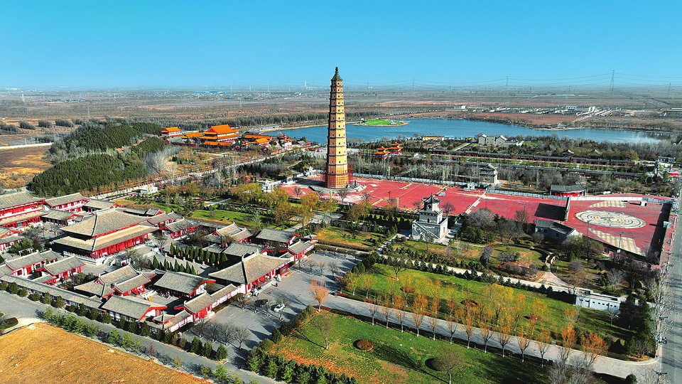 11月27日,全国重点文物保护单位汾阳文峰塔的修缮改造工程正有序推进。这座高84.93米的古砖塔矗立在文湖旁,周边配套古建院落与广场已见雏形,塔体及附属区域的保护性施工同步开展。(郭炳中 摄)