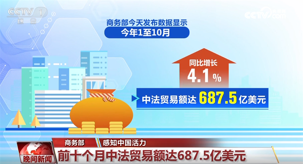 商务部12月4日发布数据显示,今年1至10月,中法贸易额达687.5亿美元,同比增长4.1%;双向投资稳中有升,投资总额已超270亿美元。