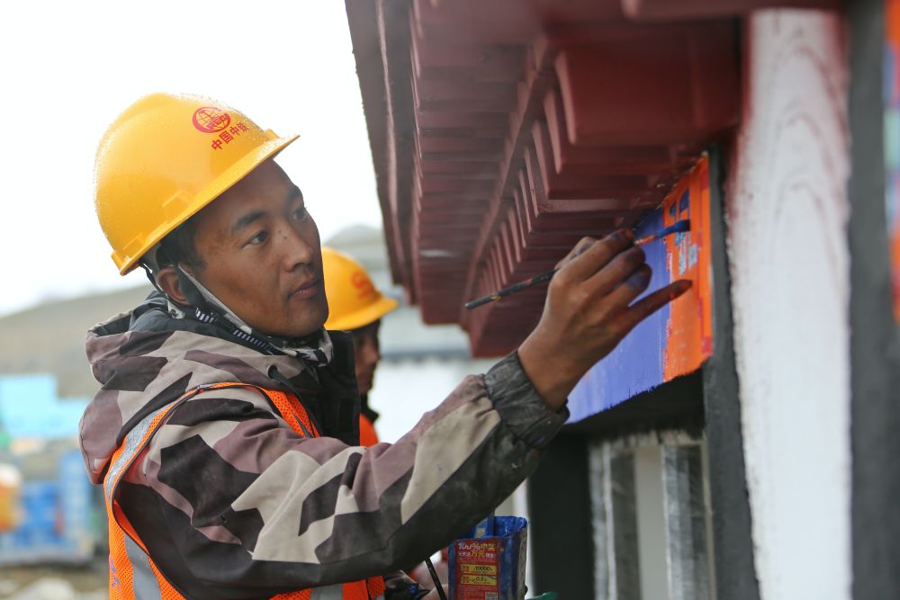2025年8月11日,定日县曲洛乡措昂村彩绘工匠扎西、旦增贡加、拉巴在工作现场。他们都是本村受灾群众,通过参与新房建设获得劳动报酬。