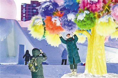 游客在呼伦贝尔“绒绒雪世界”打卡拍照。