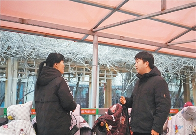 1月5日,河北省曲阳县永宁社区永宁花园小区内,社区干部(右)向居民了解车棚使用情况。 受访者供图 |