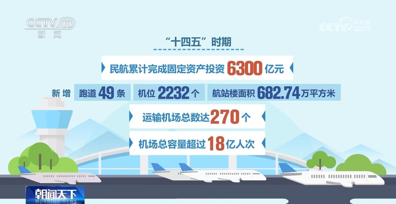 “十四五”时期,民航累计完成固定资产投资6300亿元,新增跑道49条、机位2232个、航站楼面积682.74万平方米,运输机场总数达270个,机场总容量超过18亿人次;净增运输飞机671架,机队总规模达4574架;“10+3”骨干航路网基本建成。