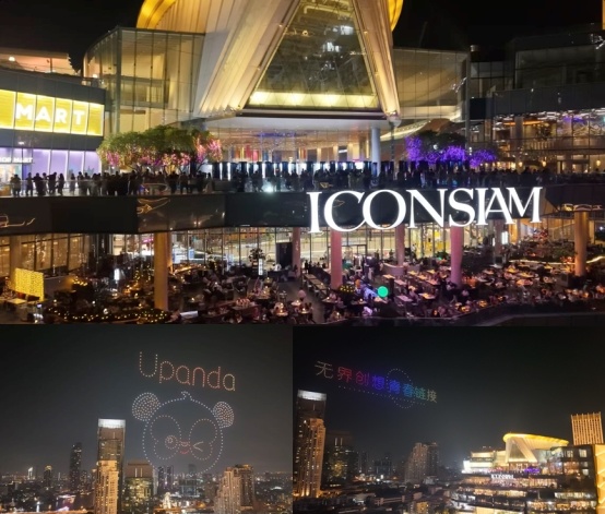 16日在曼谷地标建筑暹罗广场举办的无人机秀,通过千架无人机组成中国天坛、泰国黎明寺、京剧脸谱、孔剧面具等中泰经典文化符号,运用创新科技传递文化之美。