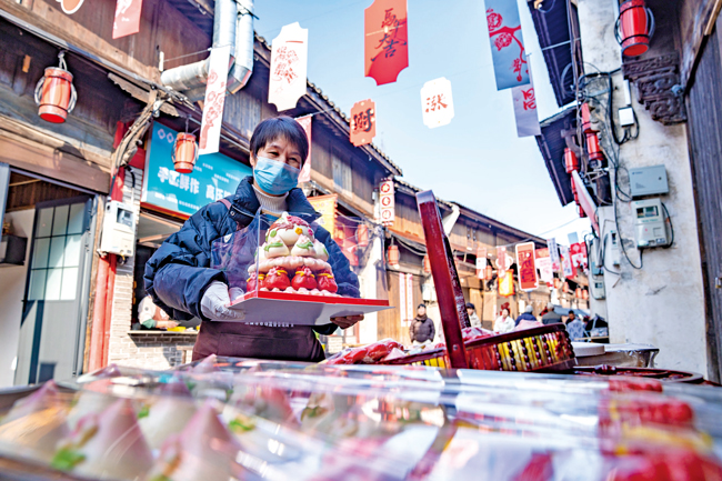 1月28日,金华兰溪永昌古镇李渔风情街上李渔花馍、鸡子馃等特色美食香气四溢,各类年货摊位上商品琳琅满目。游客们漫步老街,既能驻足欣赏韵味十足的非遗戏曲表演,又能品尝地道的古镇风味。(陈业)
