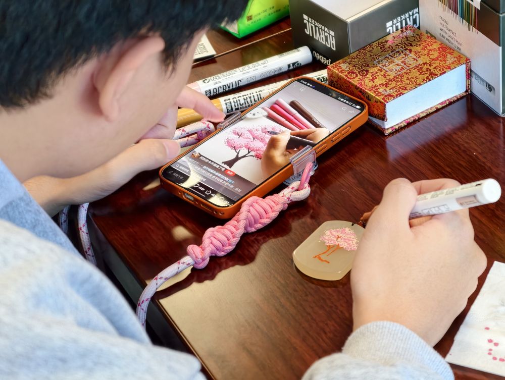 在北屯职业技术学校,同学们学习体验金丝玉手绘,画出各具巧思的作品:神情俏皮的骆驼、憨态可掬的羊羔、昂首奔腾的骏马……众多新疆“印象”跃然玉面之上。