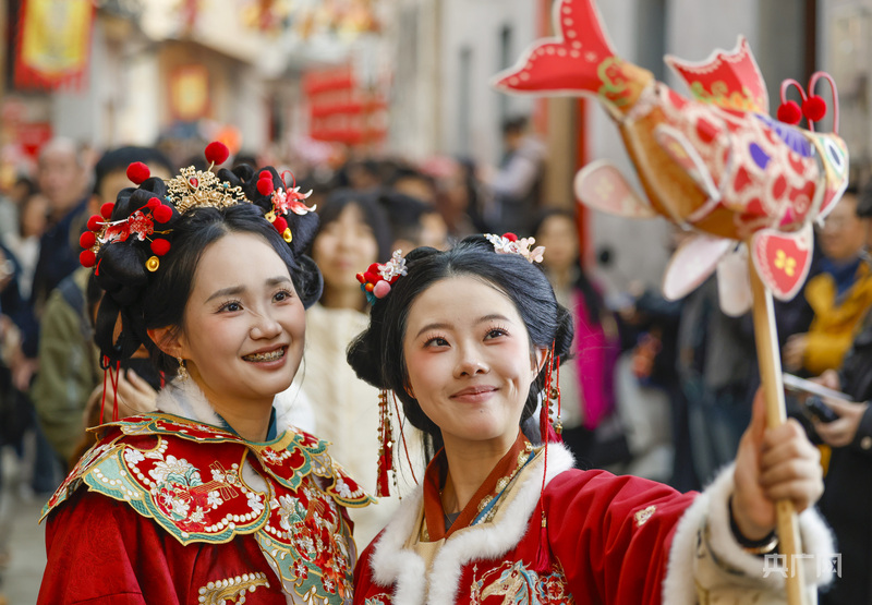 游客身着汉服手持徽州鱼灯合影留念(央广网发 施亚磊摄)