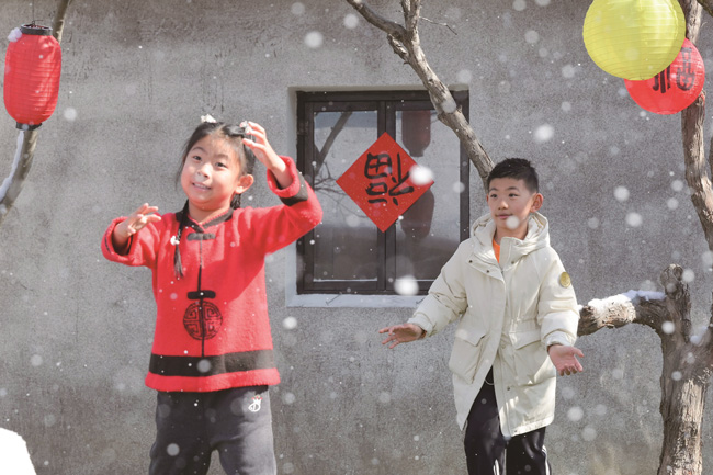 日前,在嘉兴市南湖区凤桥镇梅花洲景区内,人造雪景与红梅相映成景,皑皑“白雪”铺陈其间,红梅在枝头傲然绽放,为江南水乡增添了别样的冬日景致,不少游客驻足观赏、拍照留念,在水乡古镇里邂逅一场别致的冬日浪漫。(俞中岳)