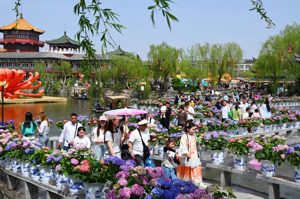 4月5日,游客在河南省开封市翰园碑林游览玩耍。新华社发(李俊生摄)