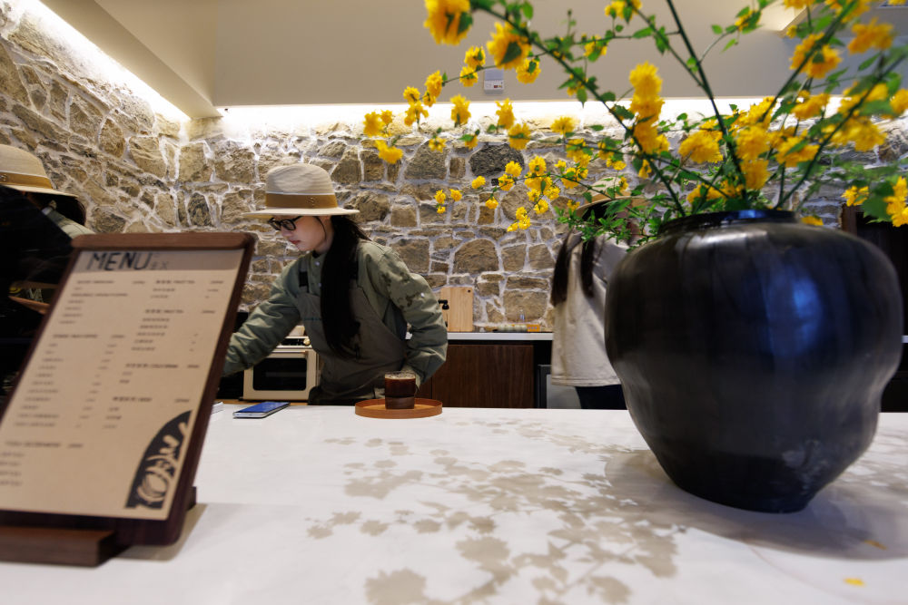 4月2日,贵州省毕节市百里杜鹃管理区普底乡迎丰村特色民宿内,工作人员在制作咖啡。新华社记者 刘续 摄