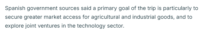 法国24新闻台的报道认为,桑切斯希望通过此访将西班牙定位为中国与欧盟27个成员国之间的重要桥梁。报道援引西班牙政府消息人士的话称,此访的主要目标是扩大经贸合作,尤其是在农产品、工业品方面,并探索双方在技术领域的合作。同时,西班牙还将利用此次访问为欧元区第四大经济体吸引新的投资。