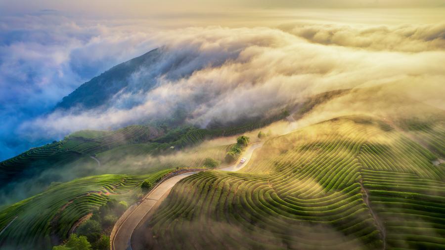 向南千里,福州连江县的炉峰山同样被茶香唤醒。万亩茶树顺着山势层层叠叠铺展,云雾在茶垄间游走,这里被称为“云端茶海”。沿着盘山公路蜿蜒而上,便到了山顶观景台。脚下是翻涌的茶浪,远处是波光粼粼的海湾。游客吴美芳坐在观景台上,捧着一杯刚泡好的茶,望着漫山青翠感叹:“在炉峰山品茗、看云海,这才是春天该有的样子。”