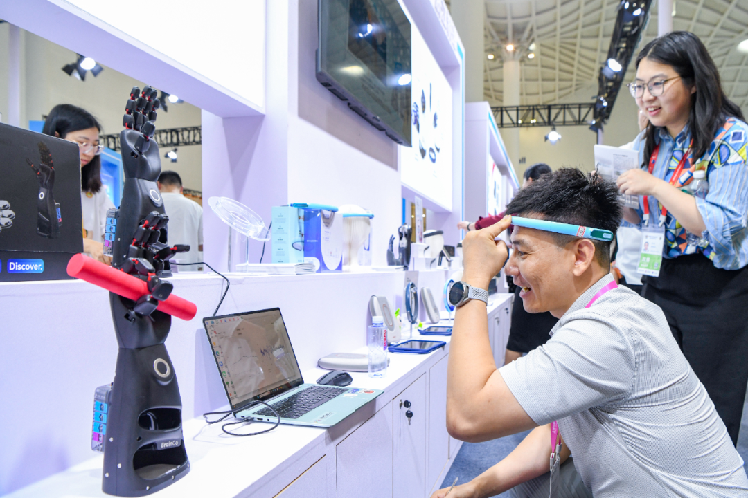 第六届消博会智能产品及外贸优品展区内,参展人员在了解脑科学人工智能设备。苏弼坤 摄