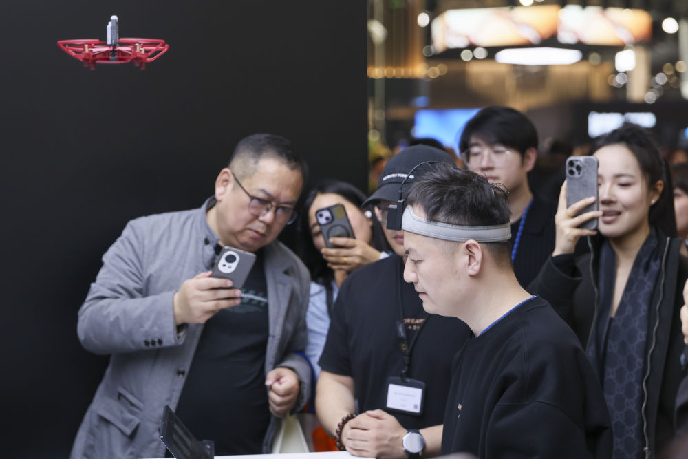 3月12日,在上海新国际博览中心追觅科技展位脑机接口展台,工作人员演示通过脑电波操作无人机。新华社记者王翔 摄